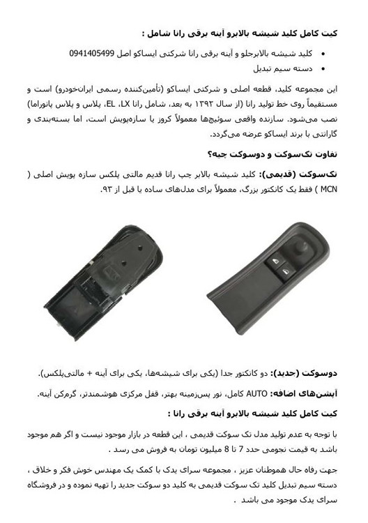 عزیزان می توانند به جای کلید قدیمی ، یک کلید شیشه بالابرجلو و آینه برقی رانا شرکتی ایساکو اصل به همراه دسته سیم تبدبل را از فروشگاه سرای یدک (با نصف قیمت کلید قدیمی) تهیه نمایند و با خیال راحت بر روی خودروی خود نصب کنند .