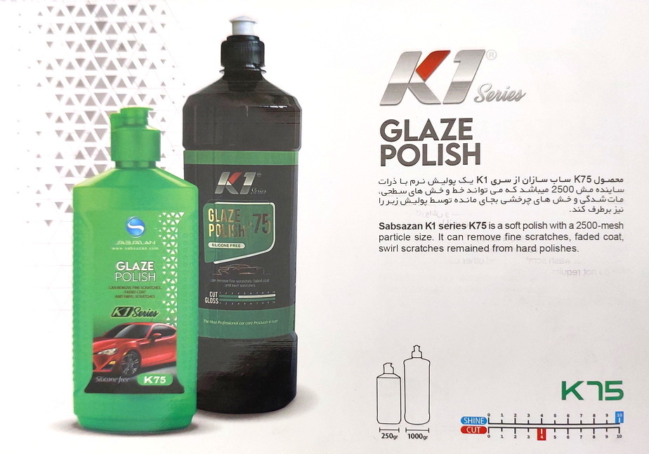 محصول K75 ساب سازان از سری K1 یک پولیش نرم با ذرات ساینده مش 2500 می باشد که می تواند خط و خش های سطحی ، مات شدگی و خط و خش های چرخشی بجای مانده توسط پولیش زبر را برطرف کند . این پولیش دارای دانه بندی نرم بوده و با حذف لایه ای نازک از روی کیلر، خط و خش های سطحی موجود روی آن را به طور کامل حذف میکند و هیچ آسیبی به سطح بدنه وارد نمیکند.